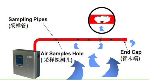 吸氣式感煙火災探測器跟傳統的(點型)煙霧探測器有所不同。空氣采樣系統由在天花板上方或下方每隔幾米平行安裝的管道組成。在每根管子的上面,每隔幾米就鉆有一個小孔,這些小孔很均勻的在天花板上分布,這樣就形成了一組矩陣型的空氣采樣孔。利用探測主機內部抽氣泵所產生的吸力,空氣樣品或煙霧通過這些小孔被吸入管道中并傳送到達探測主機內部的高靈敏度煙霧探測腔檢測空氣樣品中的煙霧顆粒濃度,可實現未現火苗時提前報警,以達到在損失未發生時就已扼殺在搖籃中。