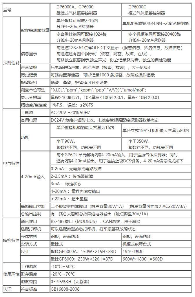 四.GP6000氣體報警控制器技術參數